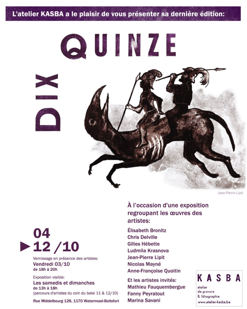 - Exposition « Dix / Quinze »L’atelier KASBA a le plaisir de vous présenter sa dernière édition intitulée « Dix / Quinze »! L’idée cette année était de voir les choses en petit, en vous proposant une petite collection de dix gravures au format cartes postales… Et comme chaque année la présentation de l’édition s’accompagne d’une magnifique exposition avec les œuvres des artistes ayant participé à l’édition!
